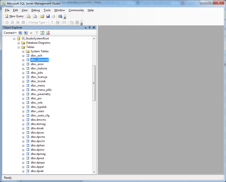 Wybór Tabele powoduje wyświetlenie listy tabel bazy SQL które są zainstalowane w bazie StudioSystem. Jak znaleźć tabele w bazie StudioSystem?