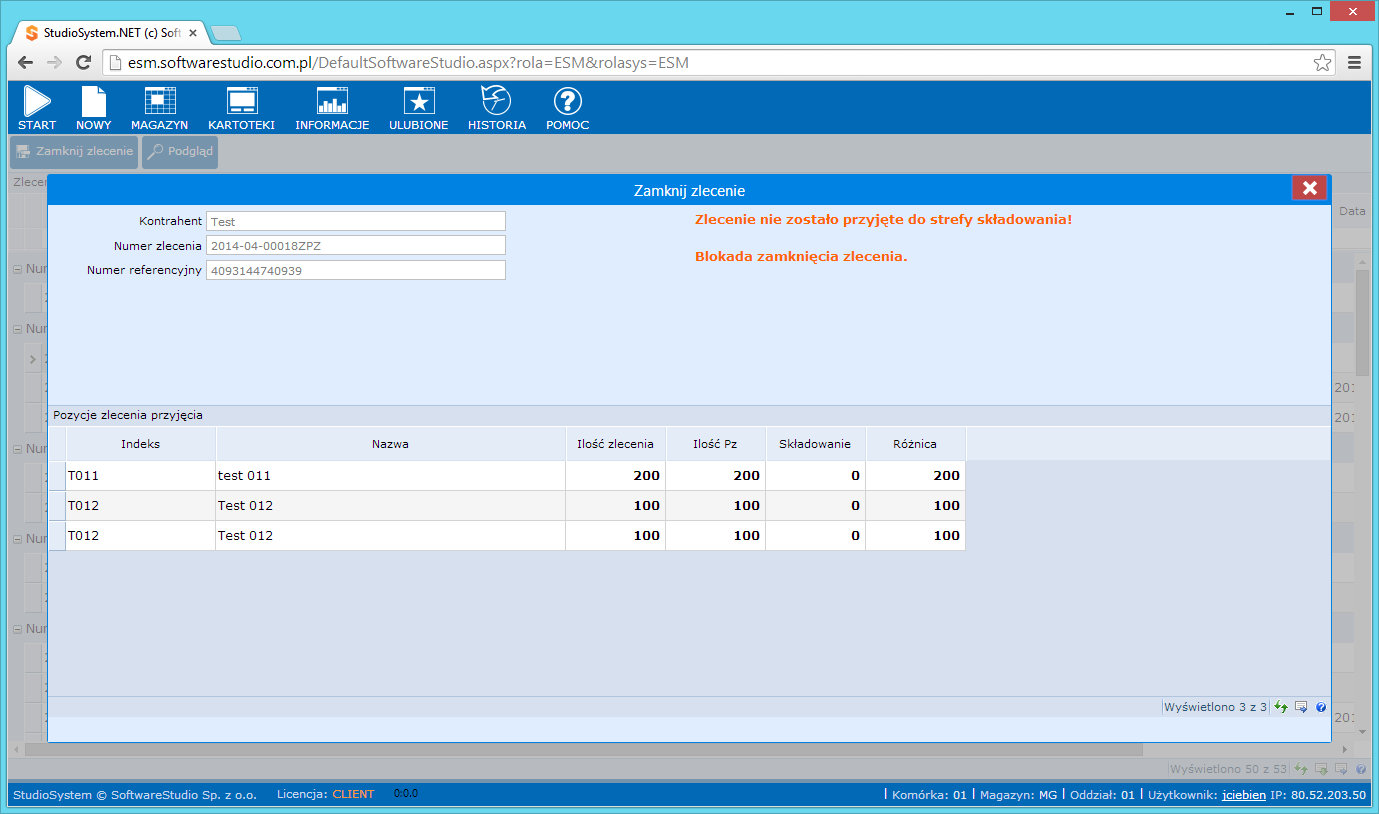 Po kliknięciu tego polecenia otworzy się formularz zamknięcia zlecenia. Wyświetli on informacje o każdej pozycji zlecenia: łączną ilość zamówioną, ilość przyjętą do strefy przyjęcia (ILOŚĆ PZ) oraz ilość składowaną. System sprawdzi, czy cały asortyment przyjęto do strefy przyjęcia i składowania. Jeśli system wykryje, że jakiegoś towaru nie przyjęto do strefy przyjęcia (pole ILOŚĆ PZ), zablokuje zamknięcie zlecenia i pokaże komunikat: „Zlecenie nie zostało przyjęte do strefy składowania. Blokada zamknięcia zlecenia”.