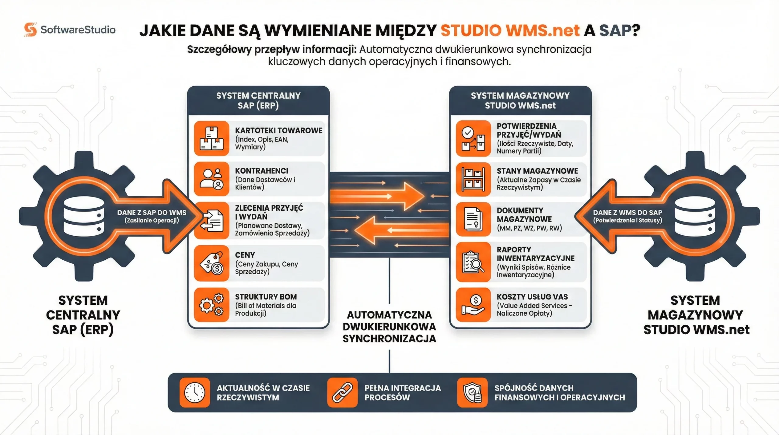 Proces integracji obejmuje przede wszystkim automatyczną wymianę kartotek towarowych, danych o kontrahentach oraz dokumentów magazynowych, takich jak zamówienia zakupu (PZ) i zlecenia wydania (WZ). System Studio WMS.net na bieżąco raportuje do SAP stany magazynowe oraz potwierdzenia wykonania operacji kompletacji i wysyłki, co eliminuje konieczność ręcznego wprowadzania danych. Taka spójność informacji gwarantuje, że dział sprzedaży oraz planowania w systemie SAP zawsze operuje na rzeczywistych danych pochodzących bezpośrednio z hali magazynowej.