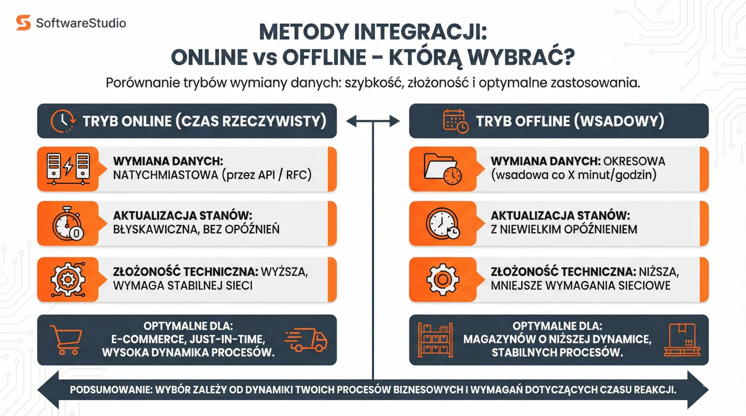 | Tryb Online (Real-Time) | API REST/SOAP, RFC (Remote Function Call), OData dla SAP S/4HANA | Natychmiastowa synchronizacja stanów magazynowych, błyskawiczne potwierdzenia realizacji zamówień, pełna transparentność operacyjna w czasie rzeczywistym | E-commerce z dynamiczną aktualizacją dostępności, produkcja Just-in-Time, centra dystrybucyjne 3PL rozliczające klientów za każdą operację |