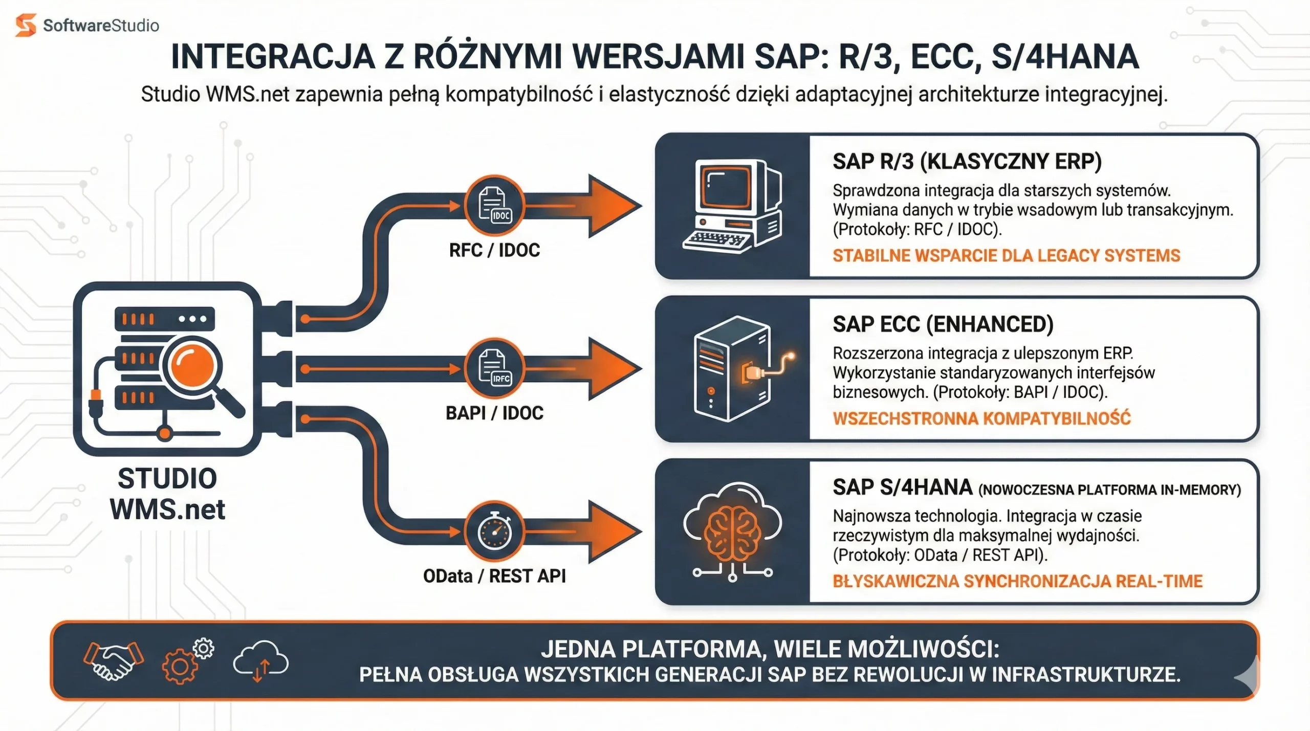 Nasze rozwiązanie Studio WMS.net jest w pełni gotowe na współpracę z nowoczesną platformą SAP S/4HANA opartą na technologii in-memory. Wykorzystujemy zaawansowane standardy OData oraz REST API, co umożliwia integrację procesów w czasie rzeczywistym z najwyższą wydajnością. Co więcej, elastyczna architektura SoftwareStudio pozwala na płynne przejście z tradycyjnych metod komunikacji na nowoczesne web-serwisy. Jednak niezależnie od wersji systemu nadrzędnego, proces synchronizacji danych przebiega zawsze sprawnie i bez zakłóceń dla operacji logistycznych.