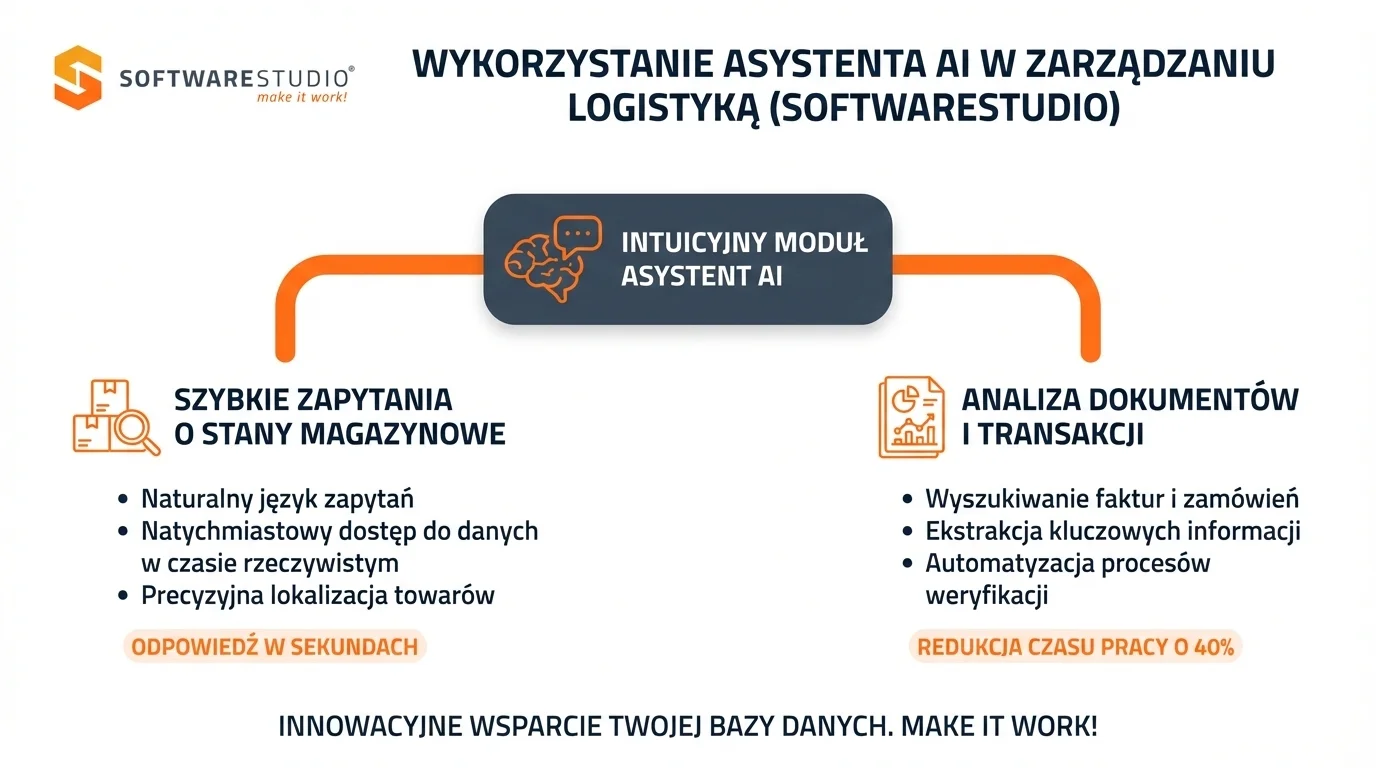 Infografika przedstawiająca wykorzystanie asystenta AI w zarządzaniu logistyką w rozwiązaniach SoftwareStudio AI Family, obejmująca zapytania o stany magazynowe oraz analizę dokumentów.