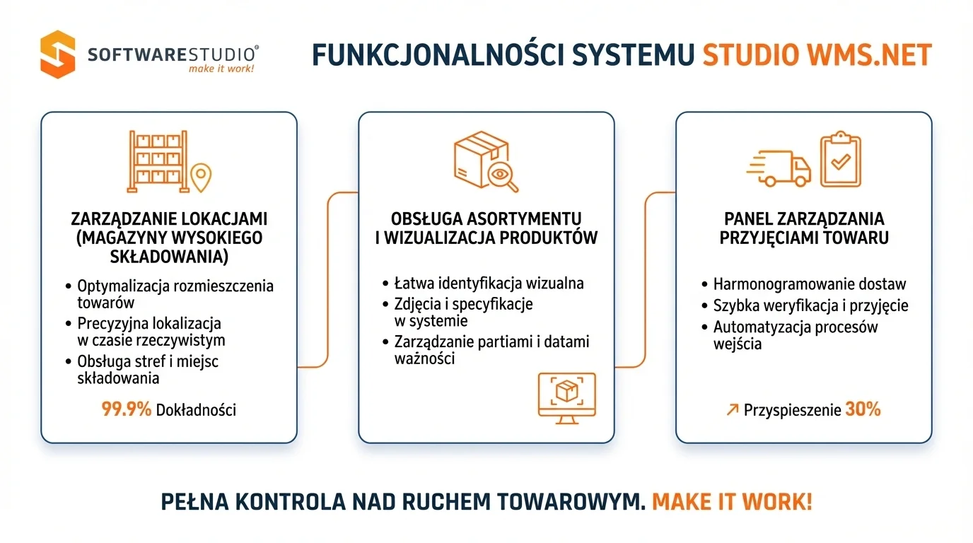 Infografika przedstawiająca kluczowe funkcjonalności systemu Studio WMS.net od SoftwareStudio, obejmująca zarządzanie lokalizacjami, obsługę asortymentu oraz panel przyjęć towaru.