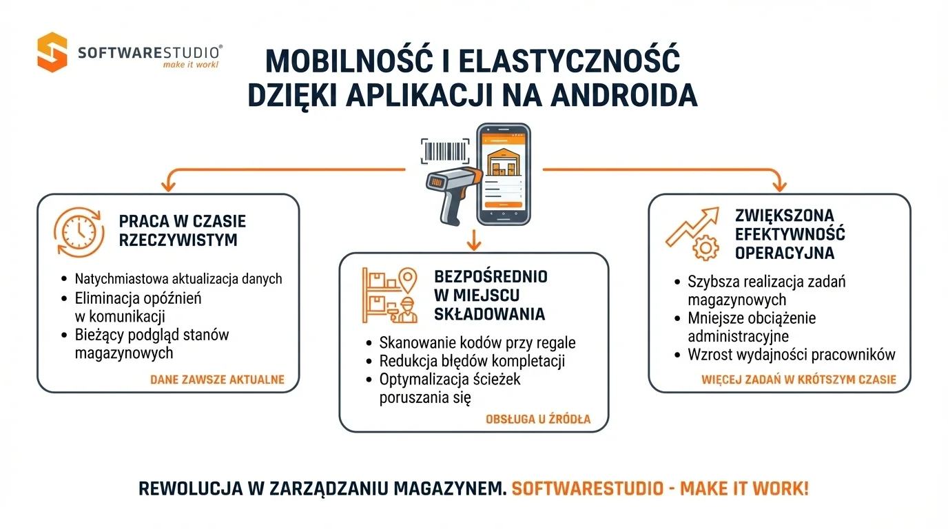 Infografika przedstawiająca zalety mobilnej aplikacji magazynowej na Androida w systemie Studio WMS.net od SoftwareStudio.
