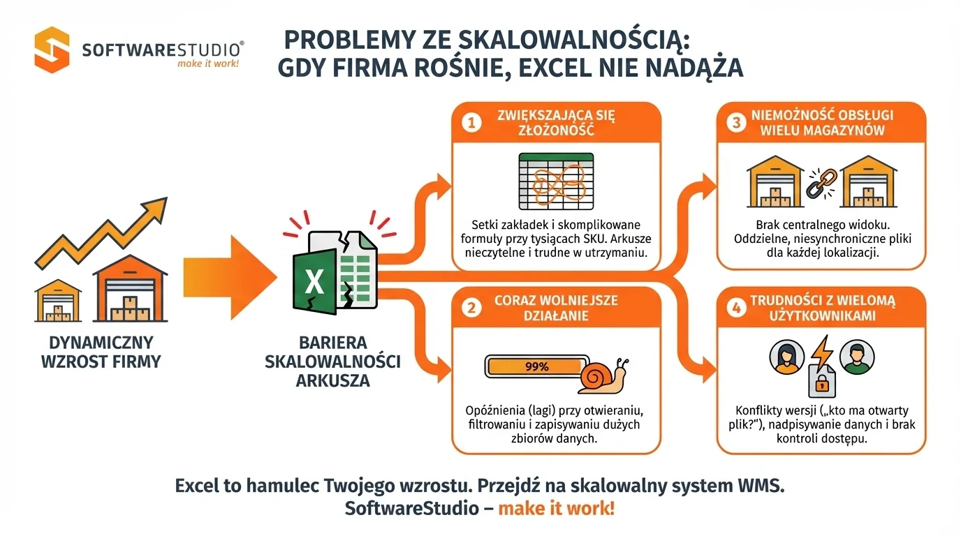 Infografika przedstawiająca problemy ze skalowalnością arkusza Excel w logistyce i korzyści z przejścia na profesjonalny system WMS od SoftwareStudio.