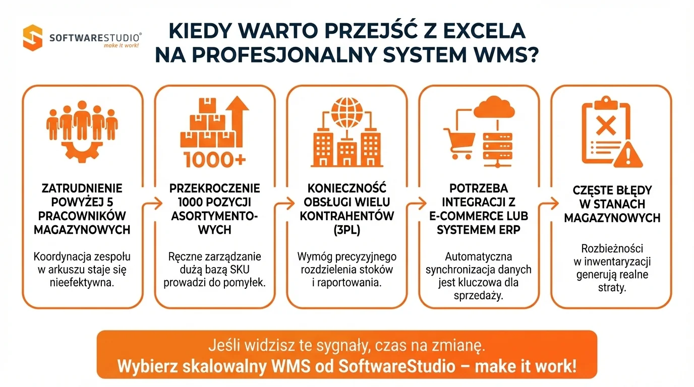 Infografika SoftwareStudio przedstawiająca 5 kluczowych sygnałów informujących o tym, kiedy warto zastąpić arkusz Excel profesjonalnym systemem magazynowym WMS.