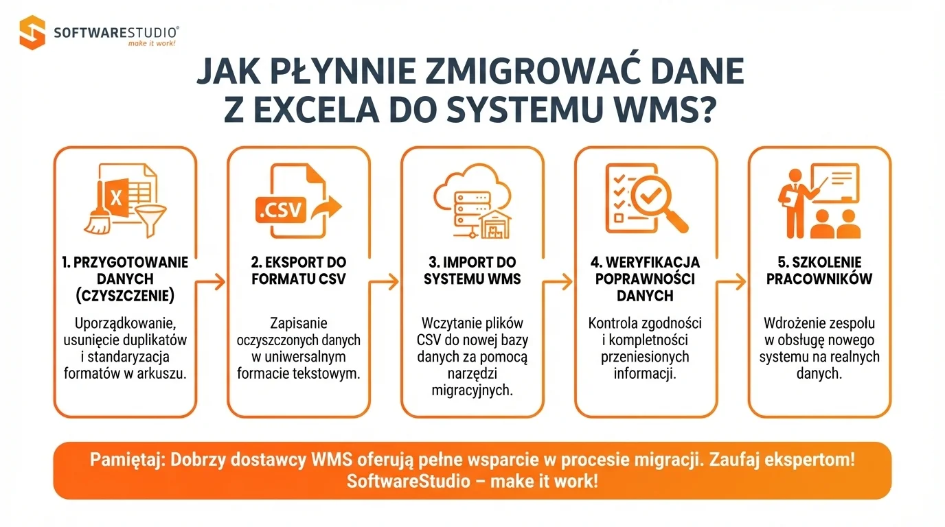 Infografika SoftwareStudio przedstawiająca 5 kroków bezpiecznej migracji danych z arkusza Excel do profesjonalnego systemu magazynowego Studio WMS.net.