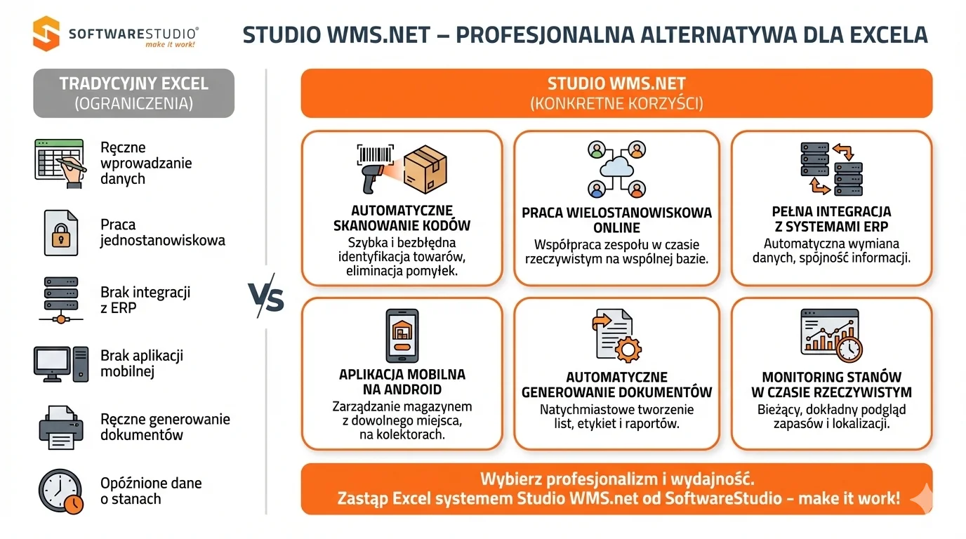Porównanie ograniczeń tradycyjnego arkusza Excel z korzyściami profesjonalnego systemu magazynowego Studio WMS.net od SoftwareStudio.