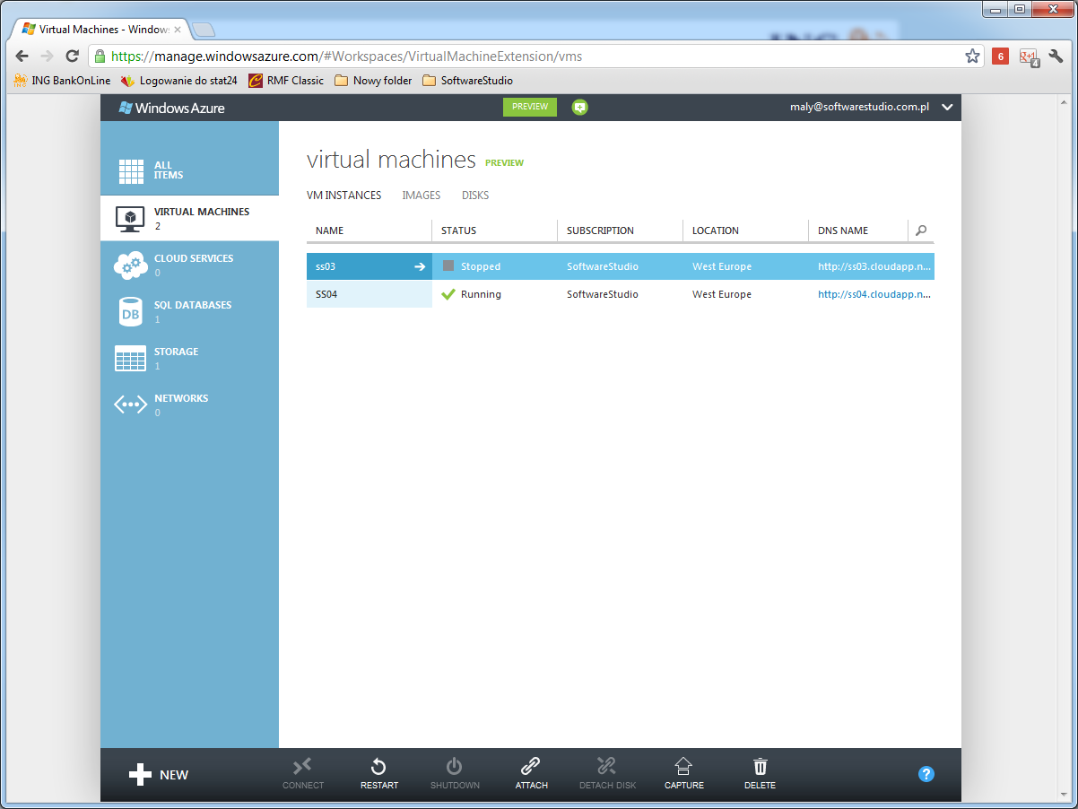 Każda usługa ma przypisany adres w domenie cloudapp.net. W ramach własnego DNS-a można przypisać alias (CNAME), który będzie przekierowywał posiadaną domenę na przypisaną do aplikacji uruchamianej na Windows Azure.