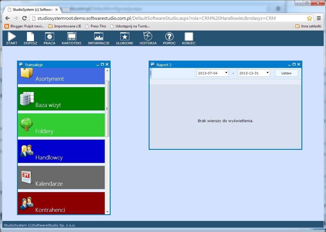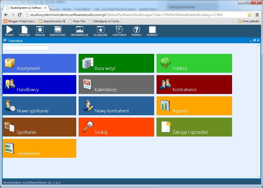Platforma StudioSystem to niesamowicie elastyczne rozwiązanie pozwalające projektować tzw pulpity menadżerskie (kokpity – dashboards). Pulpit składa się z dowolnej ilości mniejszych okienek (położenie i rozmiar każdego z nich jest osobno definiowany), która zawierają każde inną transakcję wyświetlającą interesujące użytkownika informacje.