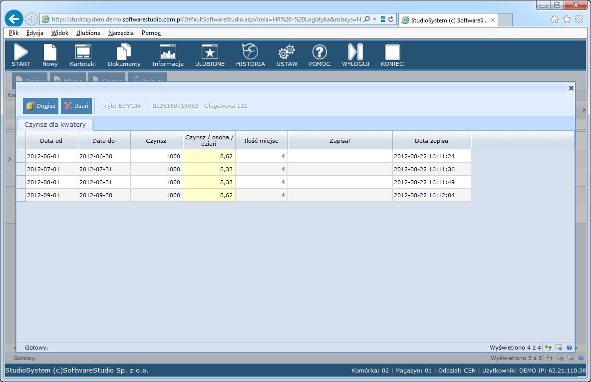Transakcja wyświetlająca czynsze za kwaterę oraz pozwalająca na dopisywanie i zmianę warunków najmu.